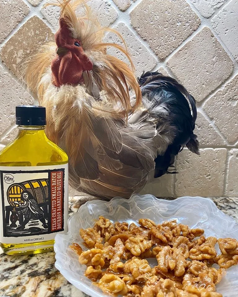 The best way I know how to deal with a Monday that makes you feel like the way this rooster looks..... bourbon olive oil candied walnuts! Because, some days you feel like a nut.. and it’s usually a Monday!! #texasoliveoil #makeitdontfakeit #crazychick #bourbon #notimported